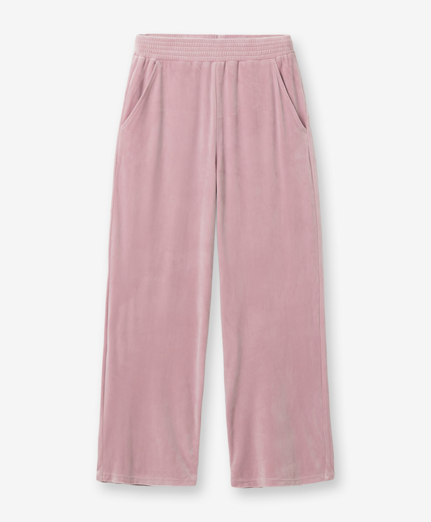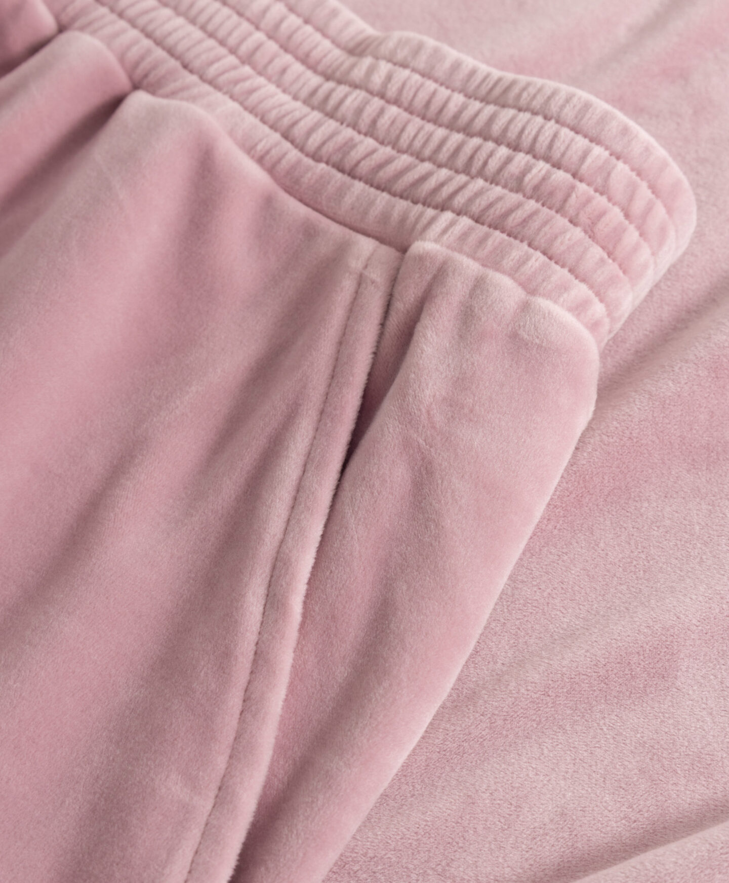 Roza spodnji del trenirke za ženske iz velurja združuje minimalizem in eleganco. Široke hlačnice zagotavljajo popolno svobodo gibanja, hkrati pa optično podaljšajo postavo in opravi dodajo pridih lahkotnosti. Zaradi mehke elastike v pasu se bodo hlače popolnoma prilegale postavi.