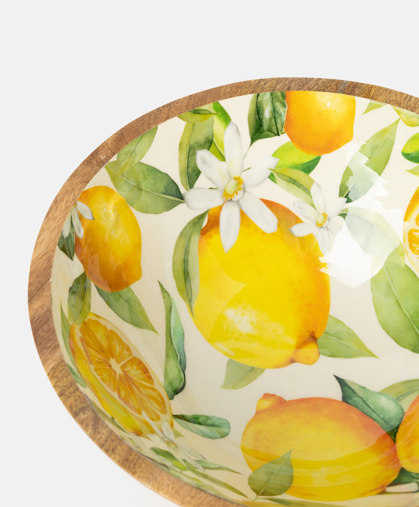 Servirno skledo iz mangovega lesa krasi pisan vzorec z motivom limon. Naraven material in tople barve bodo spodbudile apetit, zato bodo vaši obroki videti še okusnejši! V skledi lahko pripravite solato ali pa v njej shranjujete sadje. Skleda je trpežna in enostavna za čiščenje, zato je popolna za vsakodnevno uporabo.