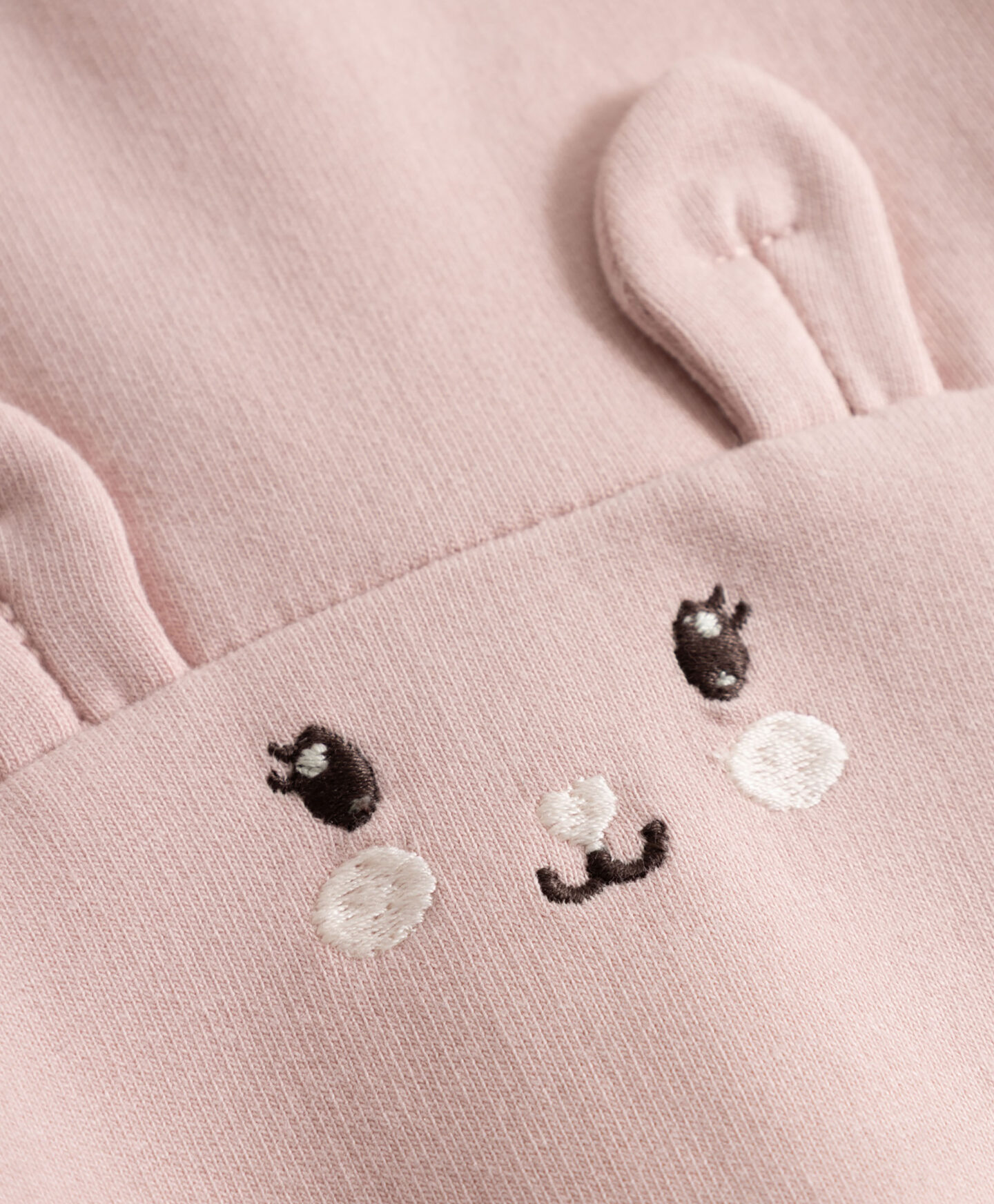 Spodnji del trenirke za dojenčice s 3D ušesi bo pritegnil pogled. Hlače so popolna izbira za modne malčice. Nežen bombažni material zagotavlja udobje že od prvih trenutkov življenja. Hlače so mehke, prijetne na dotik in zračne. Z zgornjim delom trenirke z motivom zajčka iz najnovejše kolekcije tvorijo popoln komplet.