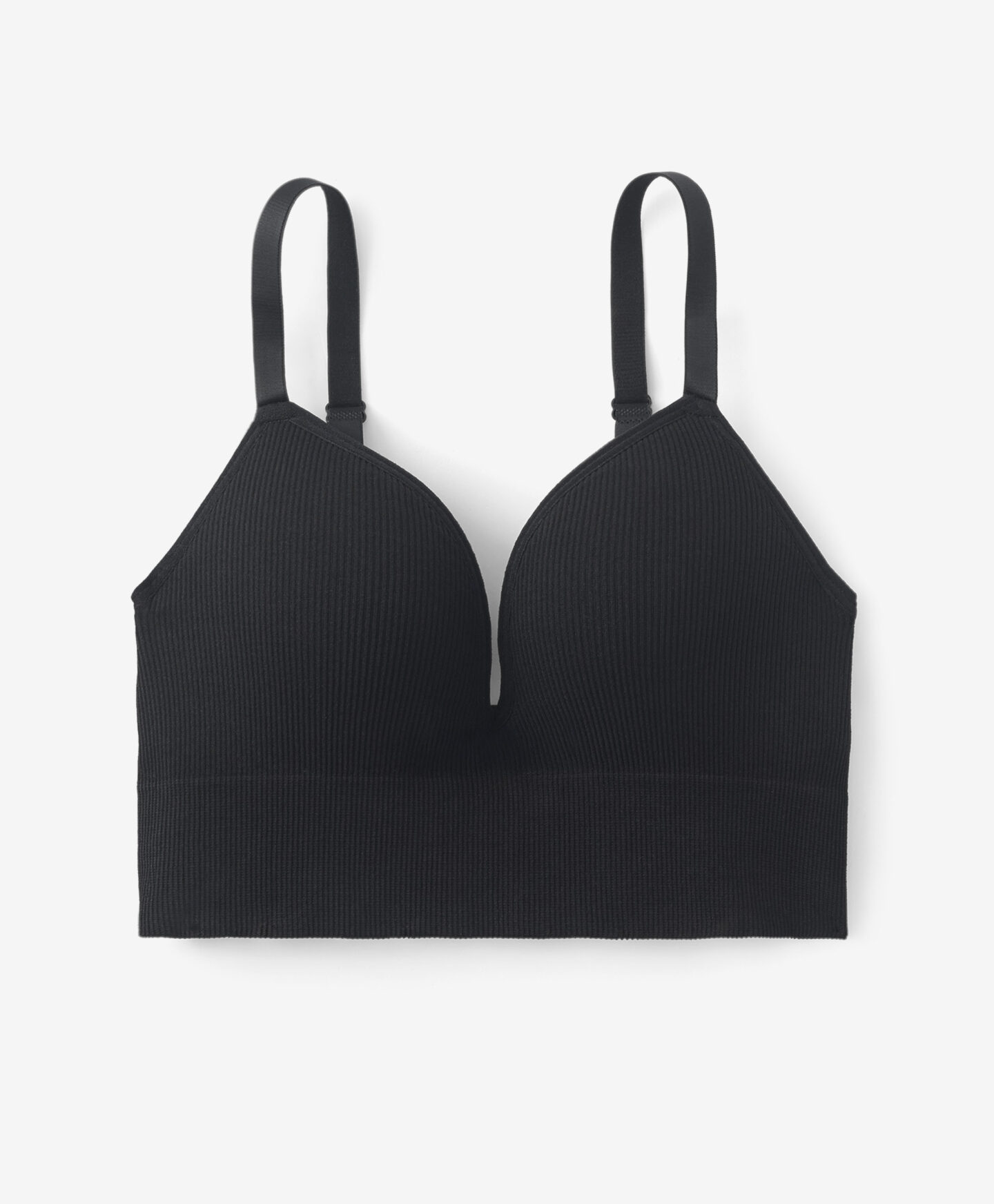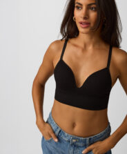 Športni nedrček podložen v črni barvi je popolna izbira za ženske, ki cenijo tako udobje kot tudi eleganten videz med telesno aktivnostjo. Unikatna oblika nedrčka zagotavlja podporo in udobje pri vseh vrstah vadbe–od pilatesa do vadbe za moč.
