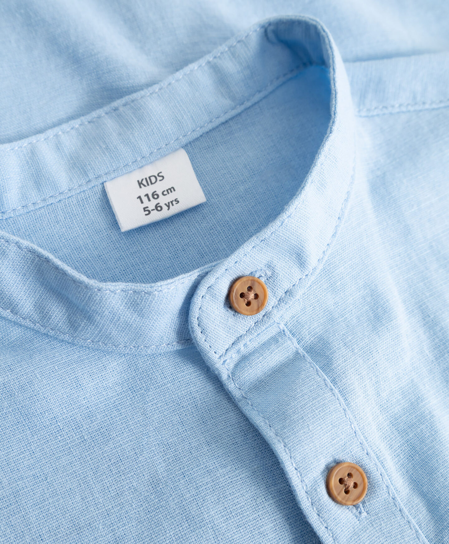 Svetlo modra srajca za dečke je popolna izbira za družinska srečanja. Dodatek lana zagotavlja zračnost. Rjavi gumbi in mini stoječi ovratnik vstopajo v kontrast z modrino srajce, kar ji daje še bolj eleganten in moderen videz. Praktični gumbi na rokavih omogočajo enostavno vihanje in zapenjanje, če želite ustvariti bolj sproščen stajling. Srajca se odlično poda tako h kavbojkam kot k bolj elegantnim hlačam.