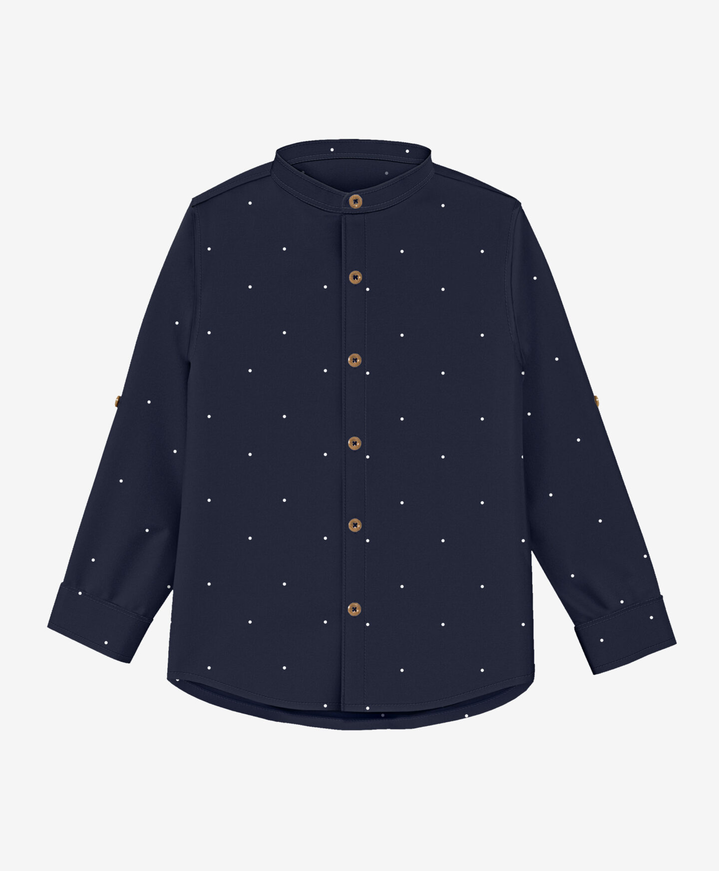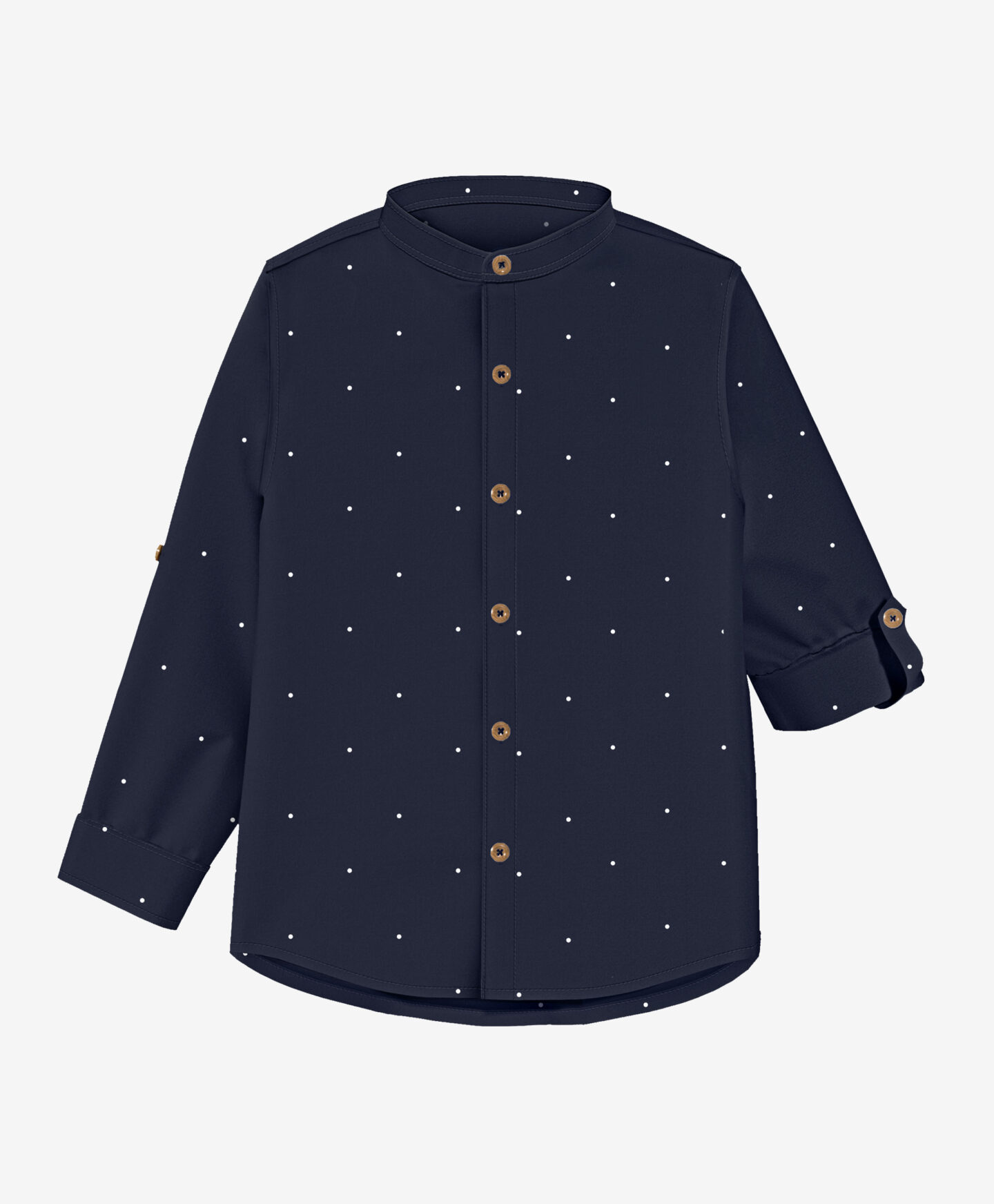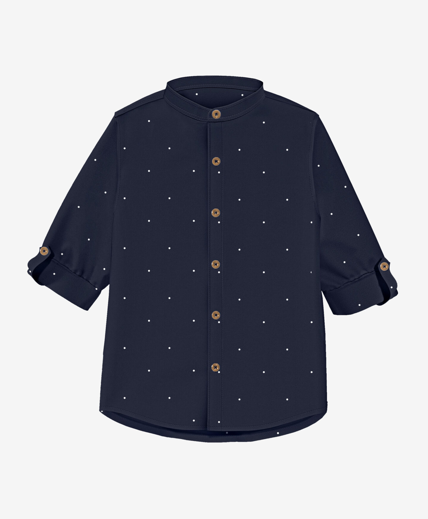Srajca za dečke pikčasta je primerna za posebne priložnosti. Pokončen ovratnik ji doda značaj in slog. Dolge rokave lahko zavihate in pritrdite z gumbom. Klasična mornarsko modra barva se bo podala tako na svetle kot temne hlače.