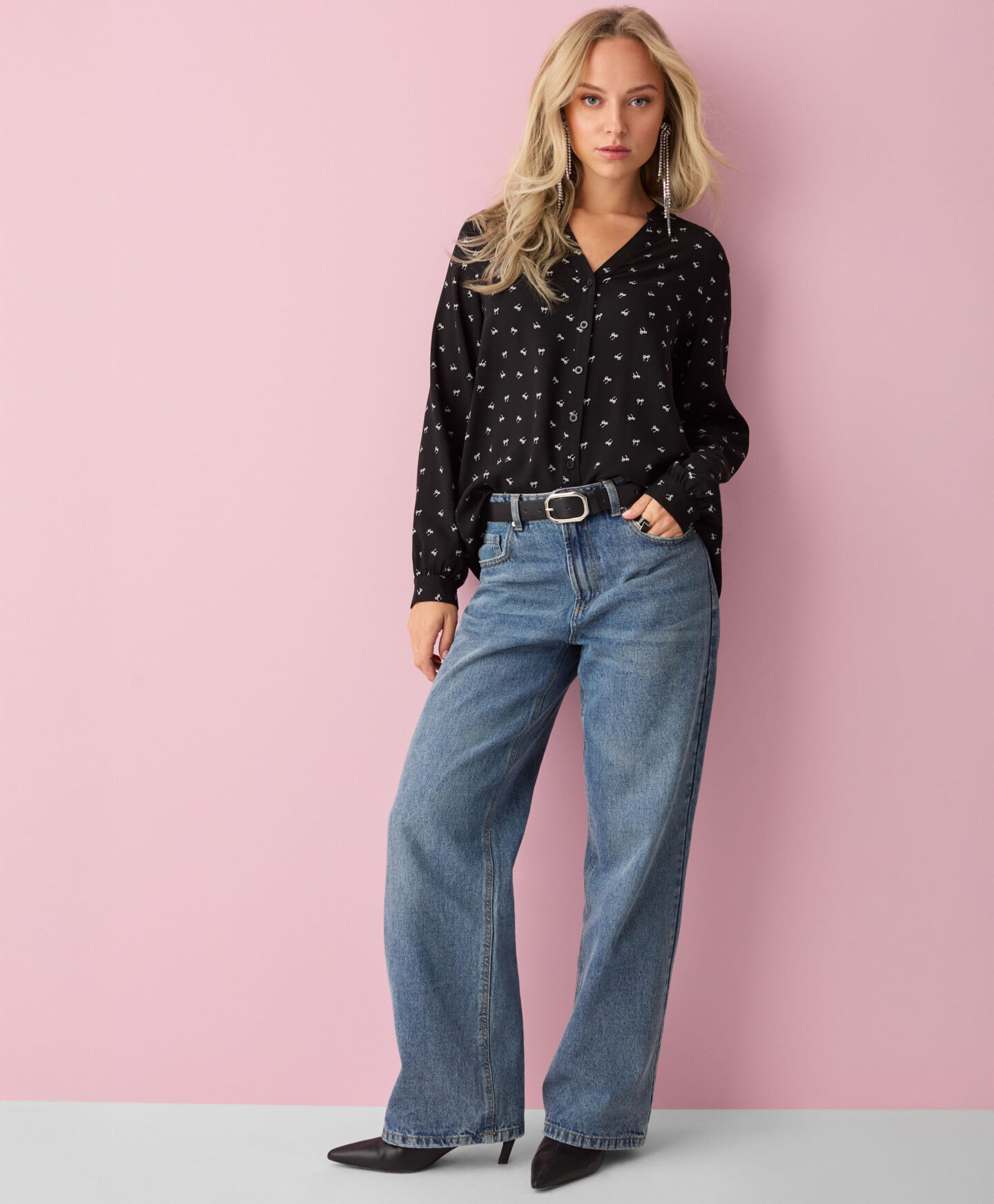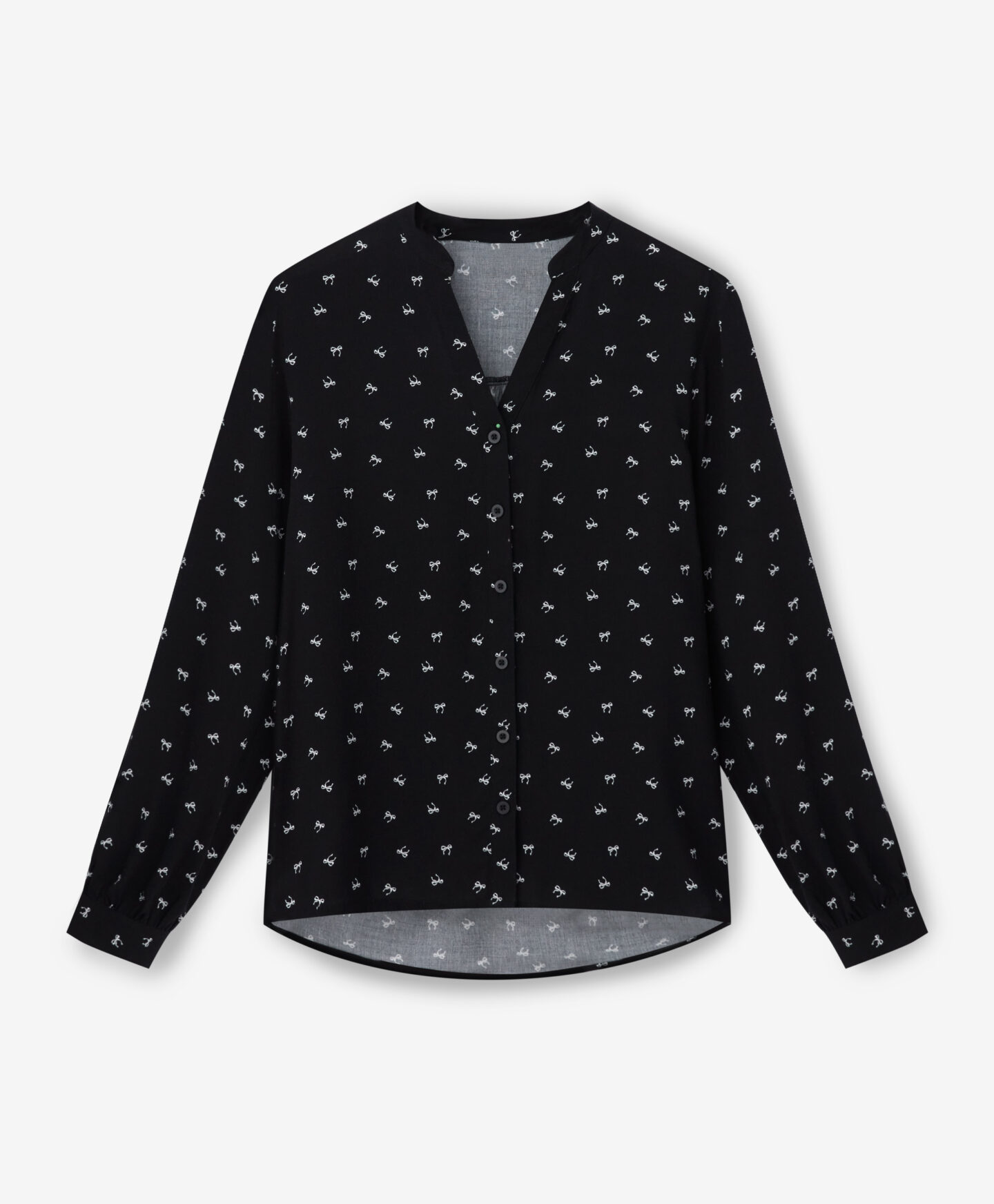 Srajco za ženske 100% viskoza z dolgimi rokavi krasi subtilen vzorec s pentljami. Je lahka, zračna in romantična. Popolna bo ne samo za vsakdan, temveč tudi za posebne priložnosti. Zaradi zračne viskoze se bo odlično obnesla pod suknjičem, puloverjem ali jopico.