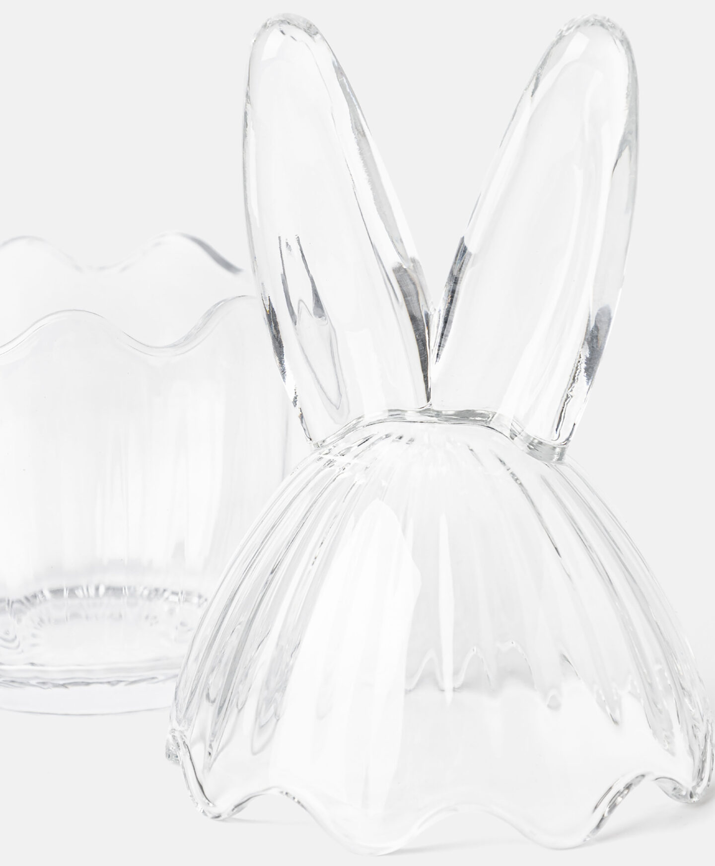 Steklena posoda za sladkarije s pokrovom v obliki zajčjih ušes je eleganten kos, ki bo razveselil tako domače kot goste za vašo mizo. Kot nalašč je za shranjevanje sladkarij, pralin ali čokoladnih jajc. Zaradi velikonočnega motiva bo izstopala med vašim posodjem in prazničnim trenutkom dodal tisto piko na i.