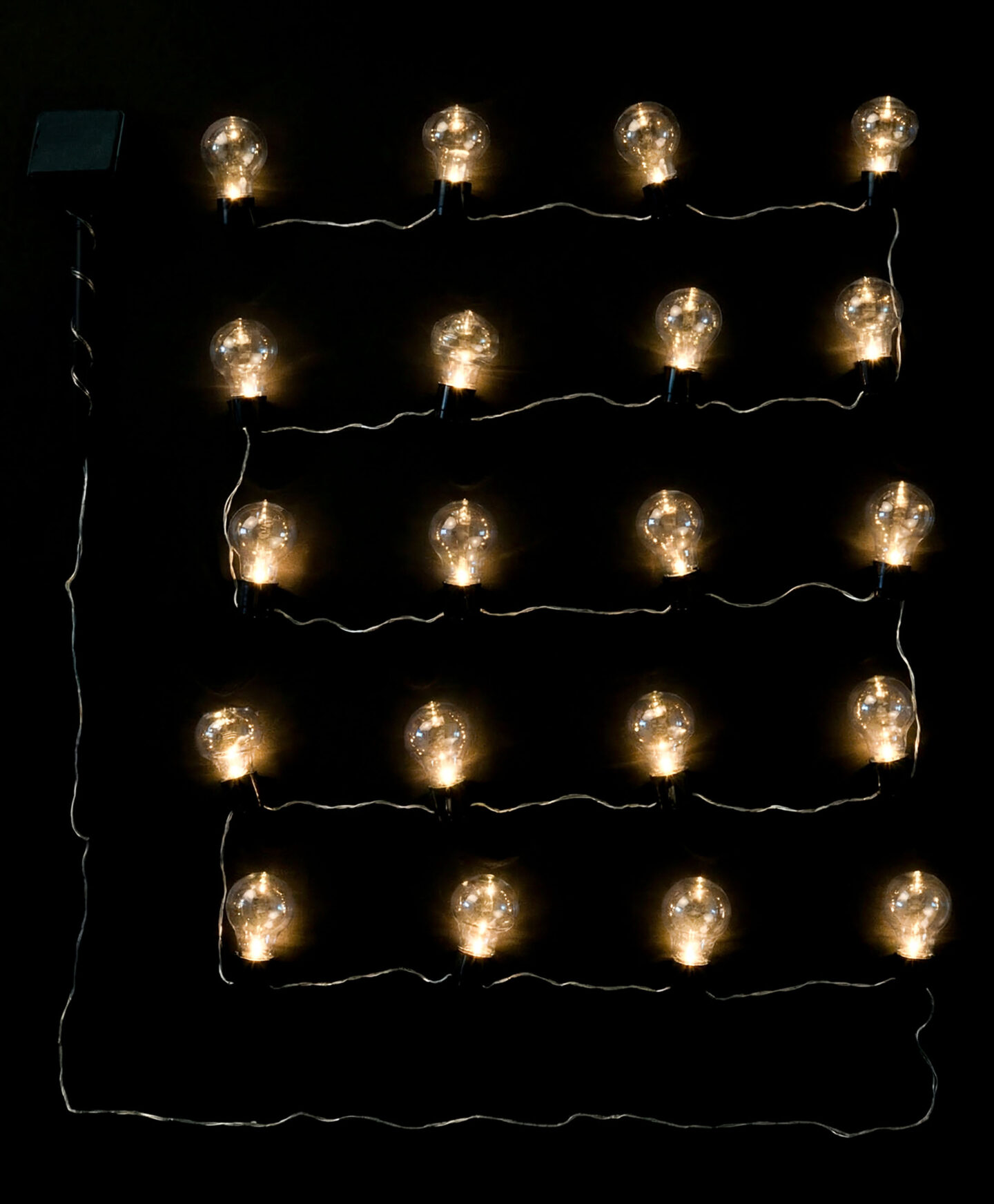 Trak solarnih luči z 20 LED žarnicami s pomočjo vgrajene sončne celice deluje brez dodatnih kablov in baterij. Sestavljen je iz 20 okrasnih LED žarnic klasičnega videza, ki pričarajo čarobno in prijetno vzdušje. Luči se samodejno prižgejo ob mraku in ugasnejo ob zori ter tako zagotavljajo nemoteno osvetlitev skozi celo noč.