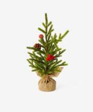 Umetno božično drevo v vrečki iz jute krasijo storži in rdeče jagode, ki mu dajejo edinstven prazničen videz. Zaradi majhne velikosti se bo odlično obneslo v manjših prostorih; postavite ga lahko na mizo, omarico ali pisalno mizo, kjer bo brez dodatnega okraševanja postalo čudovita dekoracija.