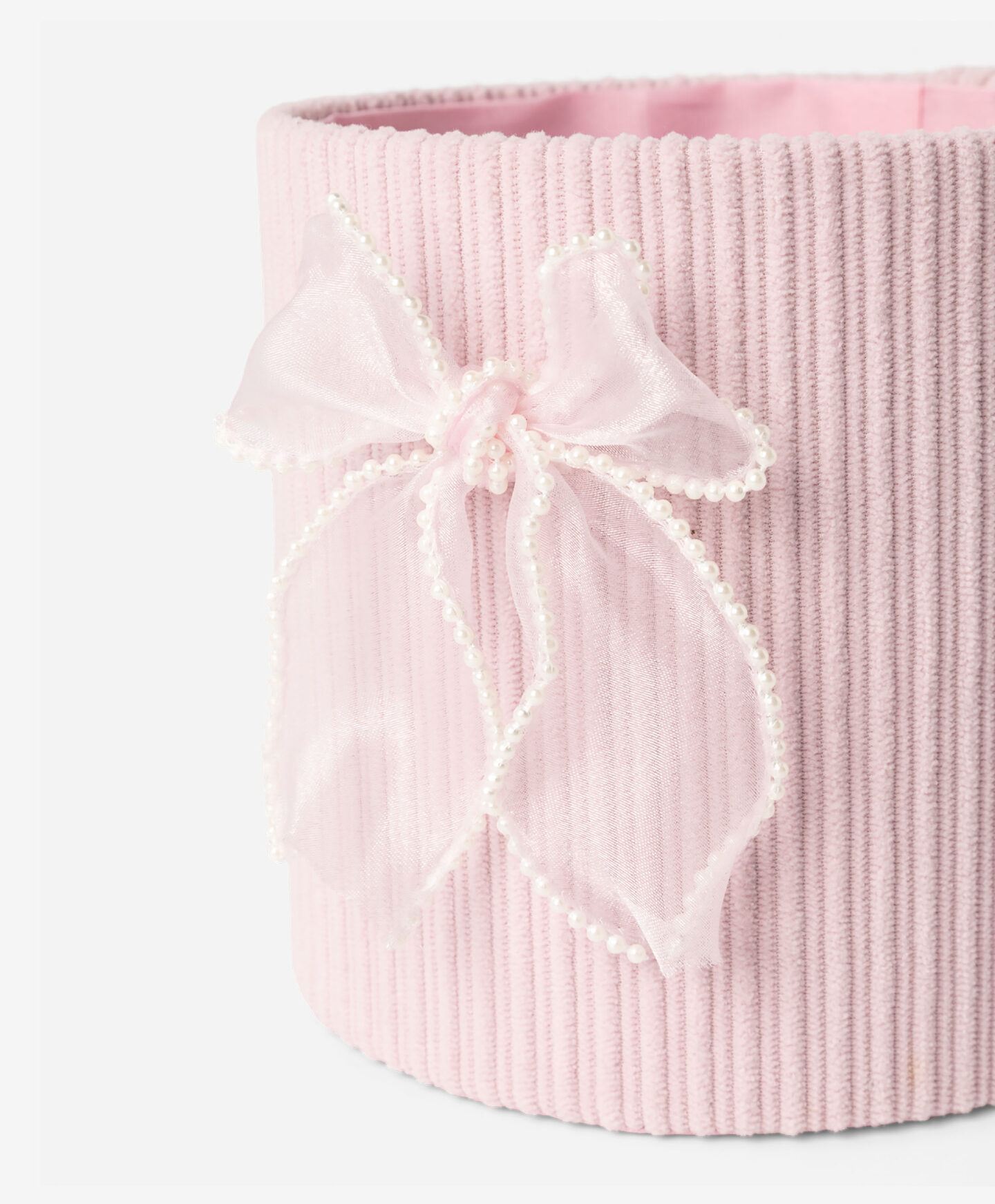 Velika okrogla škatla s pentljo služi kot subtilna dekoracija prav vsakega prostora. Popolna je za shranjevanje malenkosti, kot so nakit, ključi ali druge drobnarije. Ker nima pokrova, omogoča hiter dostop do njene vsebine. Zaradi elegantnega dizajna jo lahko postavite tako na nočno omarico v spalnici kot na pisalno mizo v pisarni.