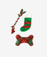 Darilni komplet za hišne ljubljenčke vključuje igrače, ki hišnega ljubljenčka spodbujajo h gibanju. Pletena vrv je kot nalašč za vlečenje, medtem ko je mehka kost primerna za žvečenje. Komplet je kot nalašč za praznično zabavo!