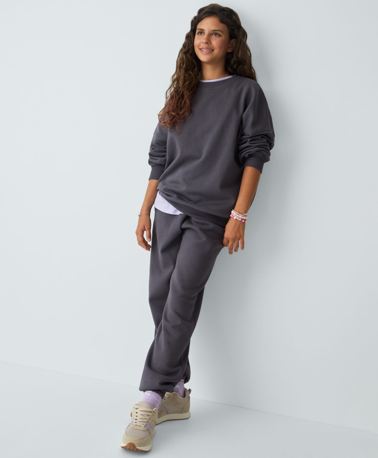 Zgornji del trenirke za deklice iz bombaža s trendovskim oversized krojem je popoln za ljubiteljice sproščene elegance. Zgornji del trenirke je topel in nežen na otip ter vašemu otroku nudi celodnevno svobodo gibanja. Popolna izbira za v šolo, za športne aktivnosti ali aktivnosti na prostem ob koncu tedna. V isti barvi je na voljo tudi ujemajoč spodnji del trenirke.