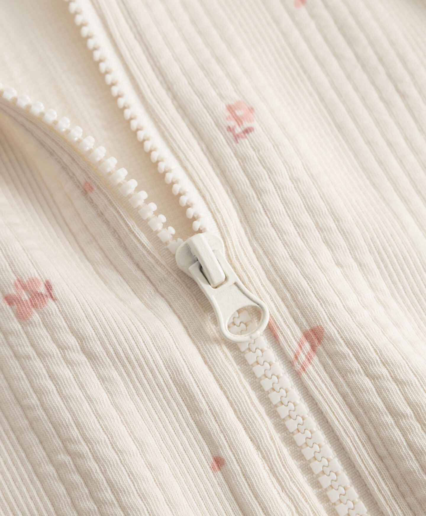 Zgornji del trenirke za dojenčice z naborki ima priročno zadrgo, ki omogoča enostavno oblačenje. Elastične manšete otroku zagotavljajo toploto in udobje. Čudovit motiv zajčkov bo popestril skupne trenutke, na družinskih fotografijah pa bo videti naravnost čudovito. Mehka tkanina z visoko vsebnostjo bombaža je primerna za občutljivo otroško kožo in je popolna za čisto prve stajlinge.
